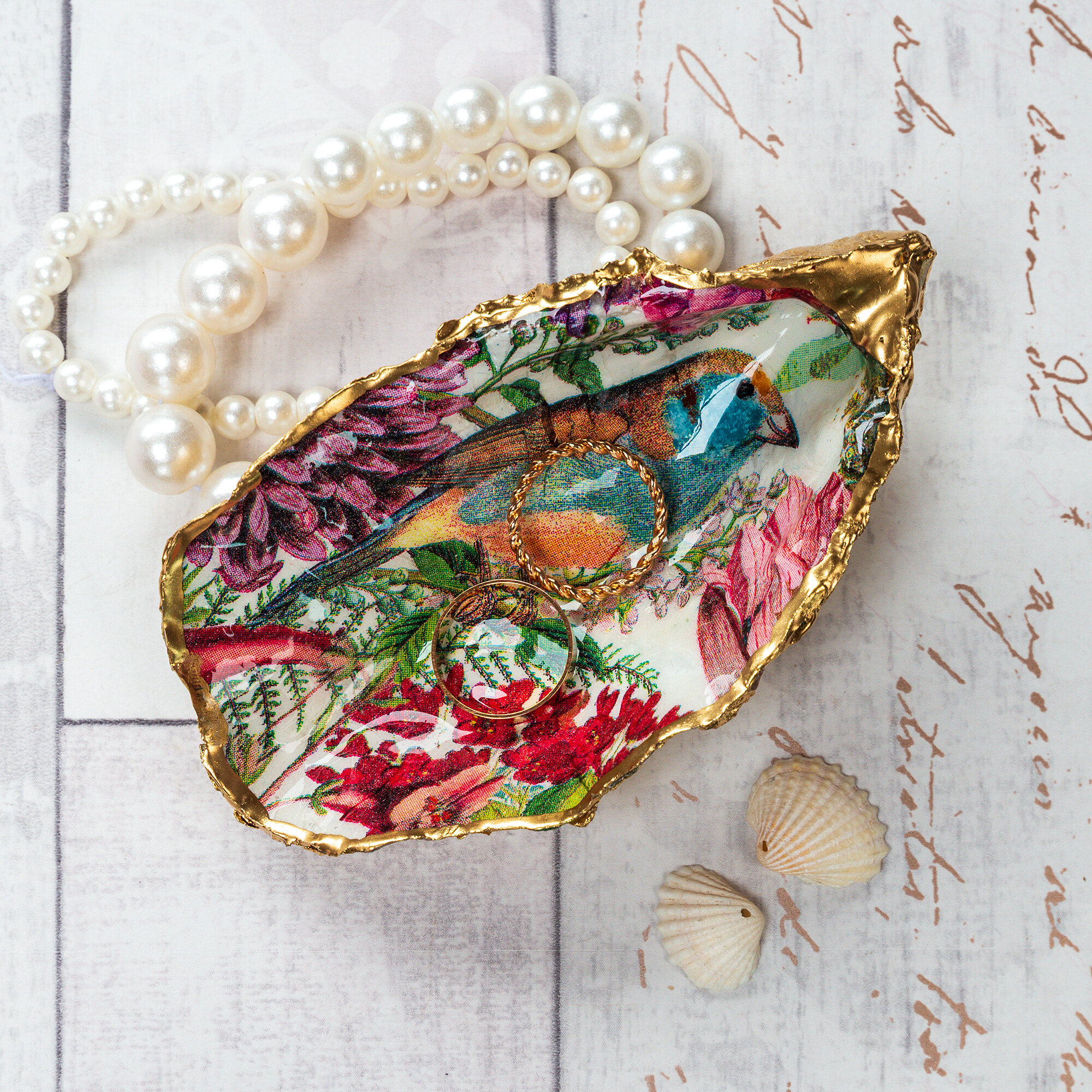 Oyster shell trinket dish in a gorgeous vintage floral design with a bird and gilded with liquid gold leaf. These make lovely gifts and are great for adding decorative accents to a bedroom or bathroom.