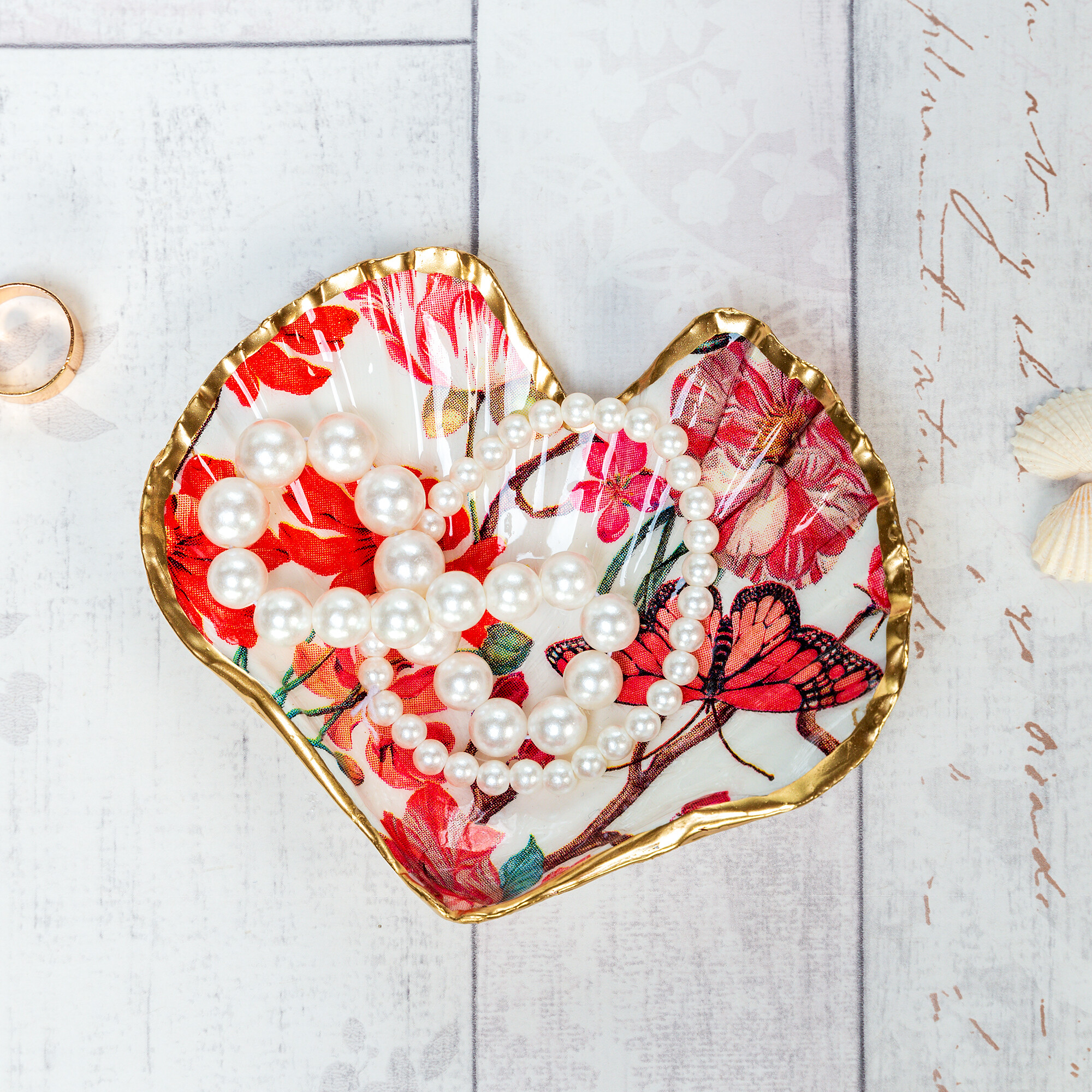 Gorgeous heart shaped trinket dish or ring tray, featuring pretty, reddish pink flowers and a butterfly. These trinket dishes are shaped by hand from natural scallop shells and make lovely Mother's Day, Valentine's or Galentine's gifts. The shells are sealed and glazed with resin on the inside, giving them durability and a beautiful glossy porcelain look. The edges of the shells are gilded with liquid gold leaf.