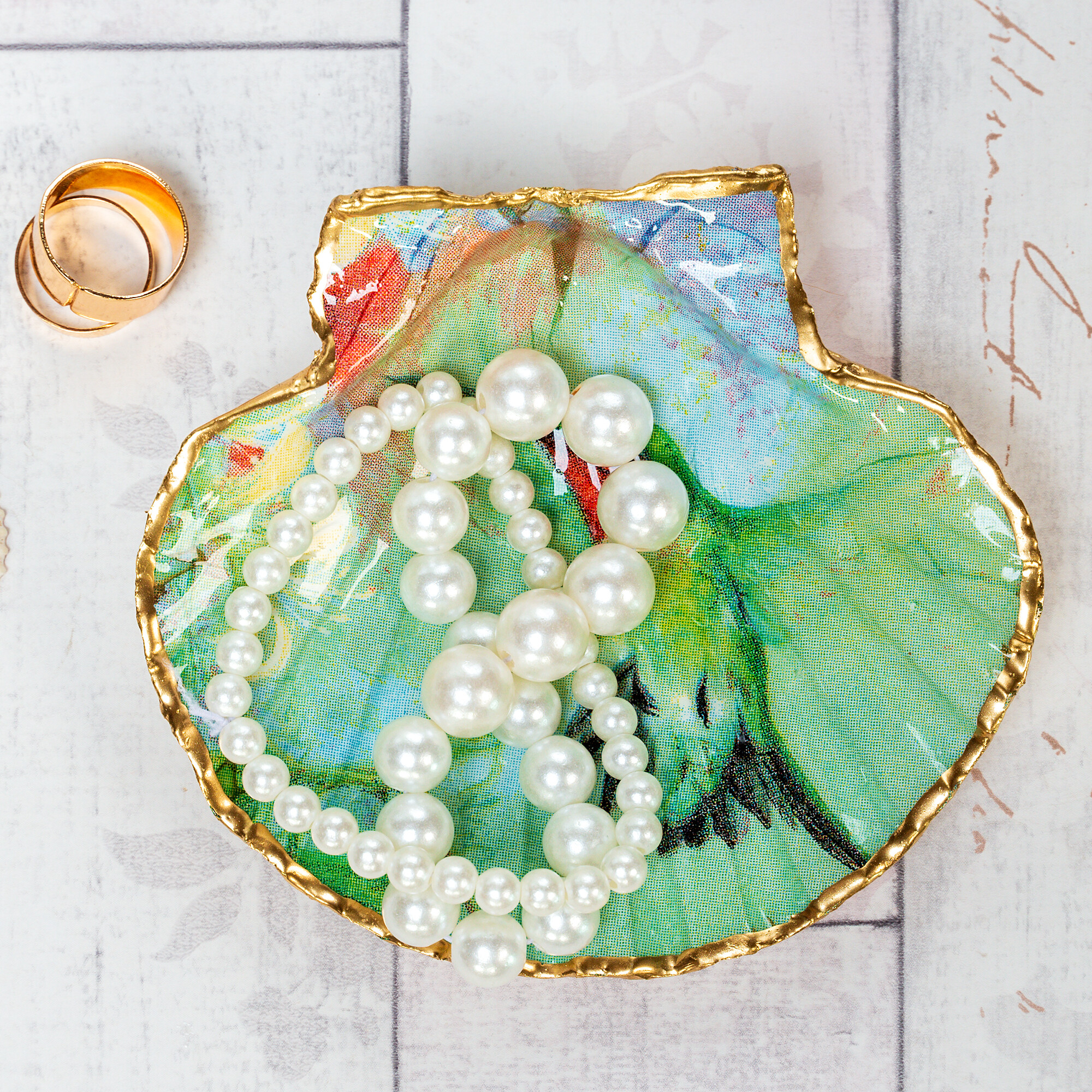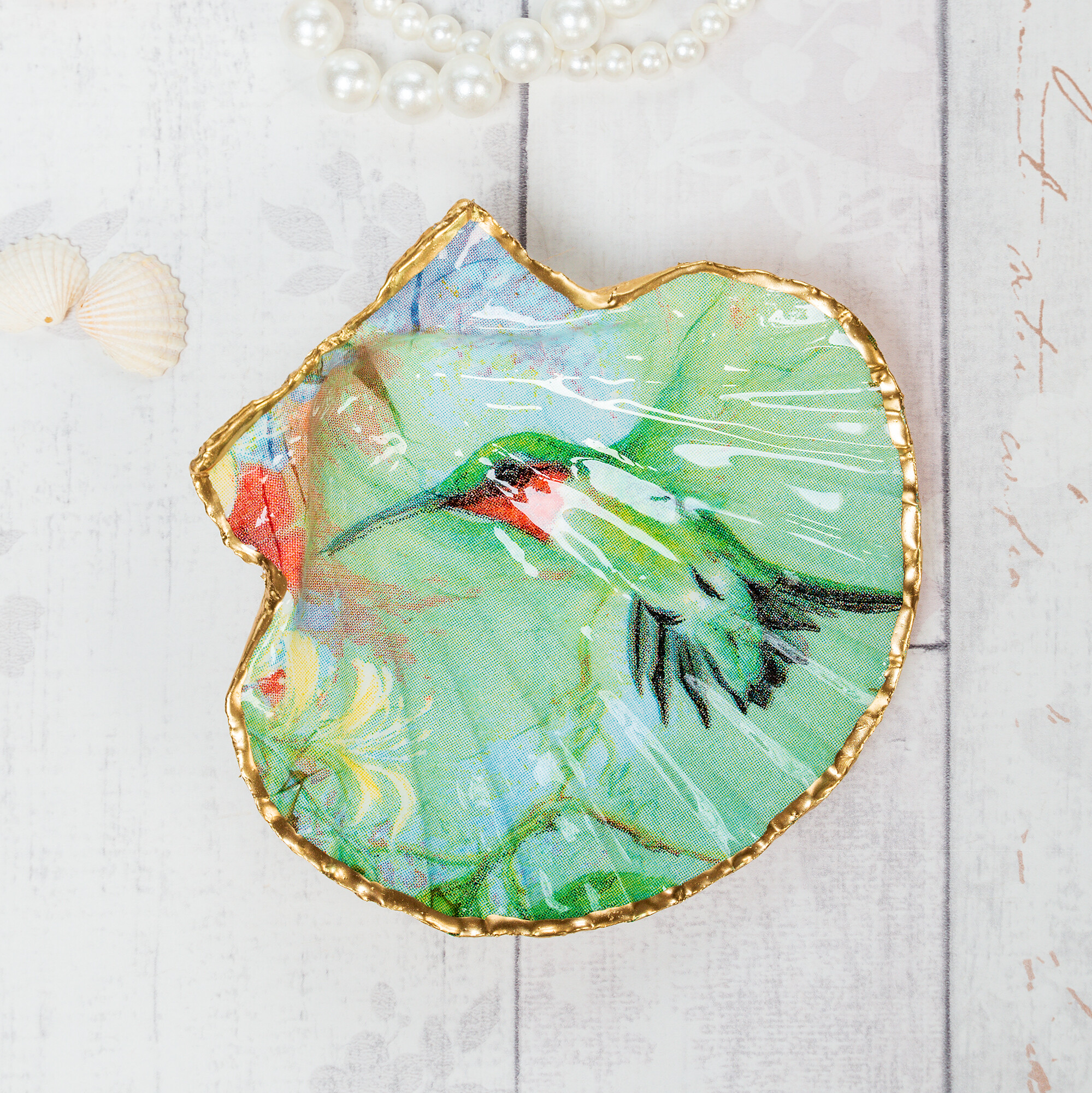 A smsller trinket dish in gorgeous green hummingbird design. These trinket dishes are handmade using the decoupage technique on to natural scallop shells. The shells are sealed and glazed with resin on the inside, giving them durability and a beautiful glossy porcelain look. The edges of the shell are gilded with liquid gold leaf.