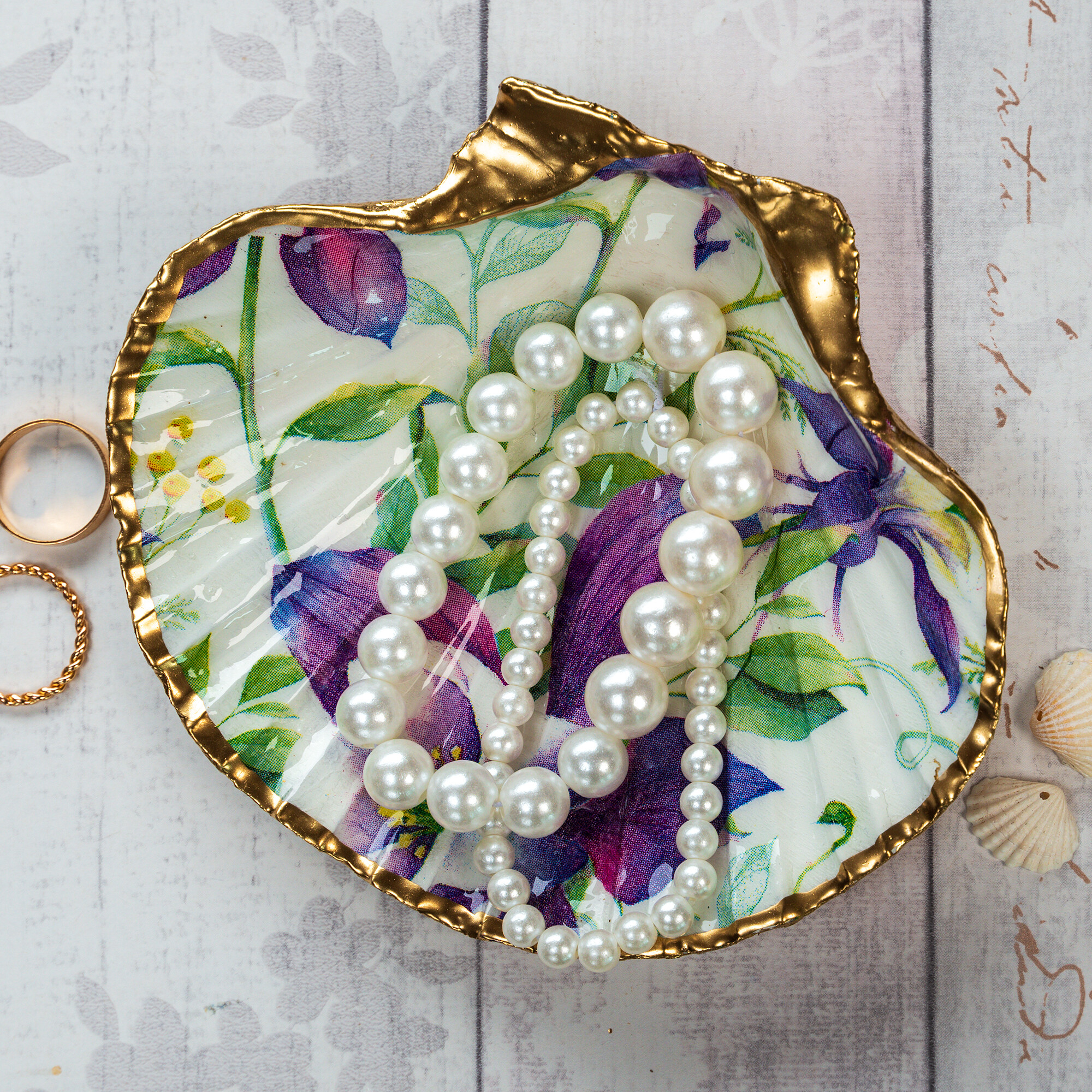 A decorative trinket dish or bowl in a pretty floral style with purple Aquilegia flowers. These trinket dishes are handmade from natural scallop shells. The shells are sealed and glazed with resin on the inside, giving them durability and a beautiful glossy porcelain look. The edges of the shell are gilded with liquid gold leaf.