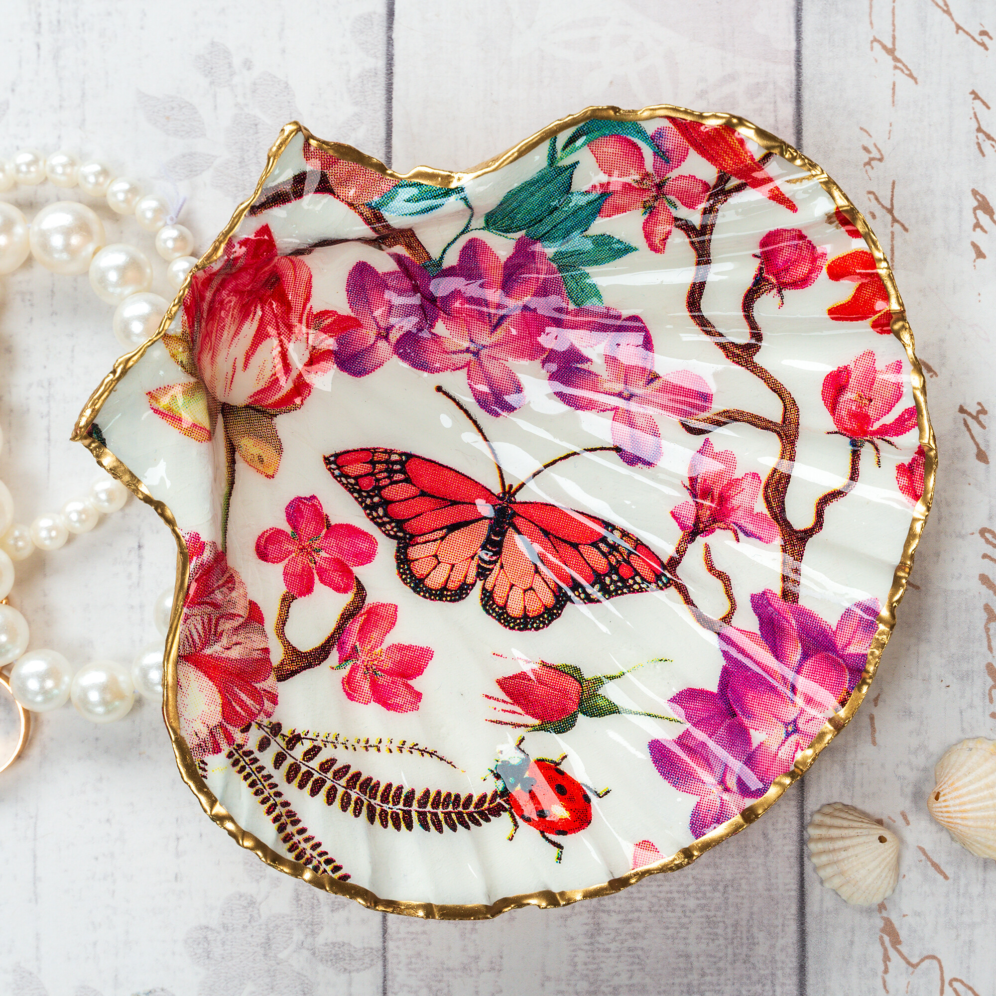 These trinket dishes are handmade by decoupaging on to natural scallop shells. The shells are then carefully sealed and glazed with resin, giving them both durability and a beautiful glossy porcelain look. The edges of the shells are hand gilded with liquid gold leaf.