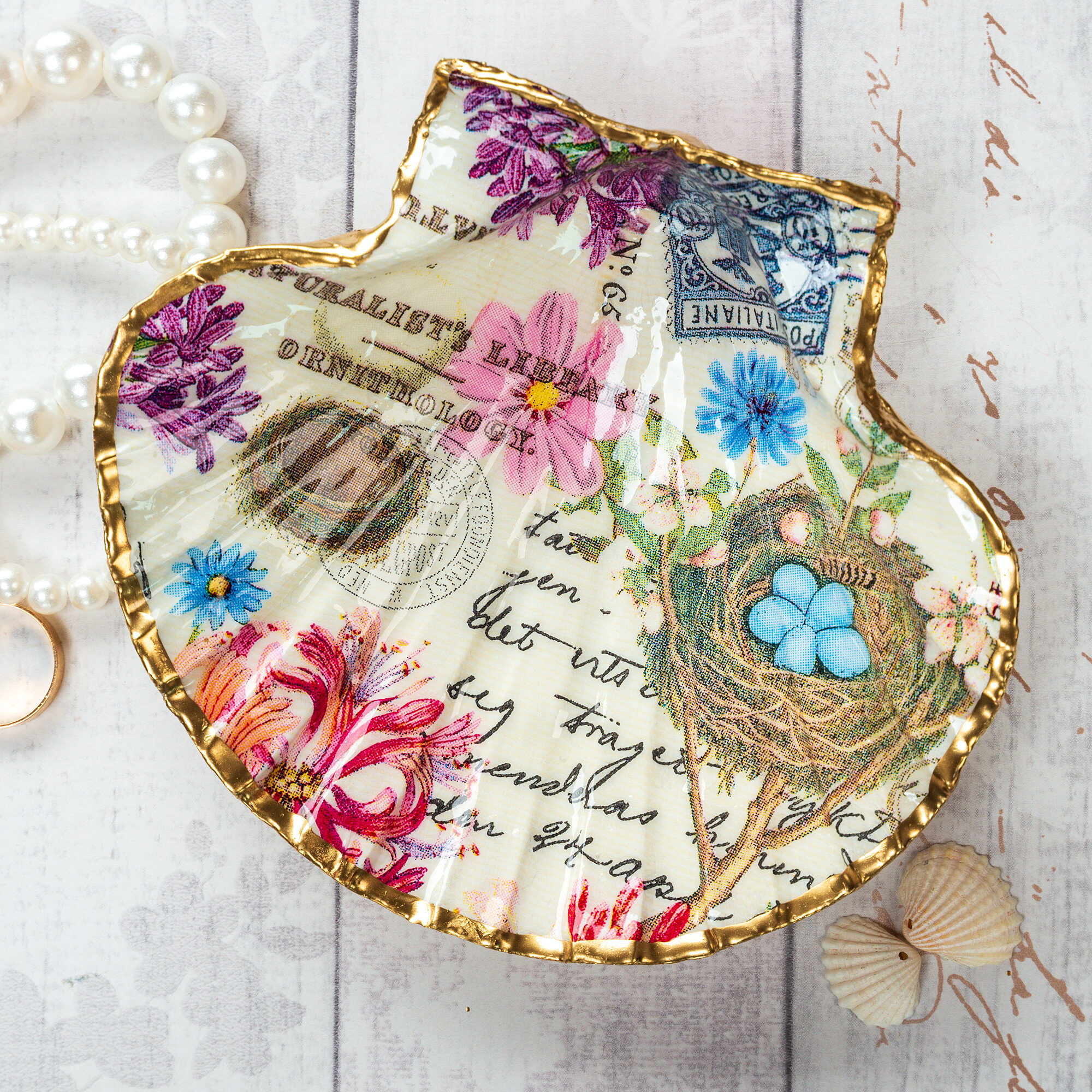 A trinket dish or bowl in gorgeous botanical design with a bird nest on a vintage, shabby chic background. These trinket dishes are handmade using the decoupage technique on to natural scallop shells. The shells are sealed and glazed with resin on the inside, giving them durability and a beautiful glossy porcelain look. The edges of the shell are gilded with liquid gold leaf.