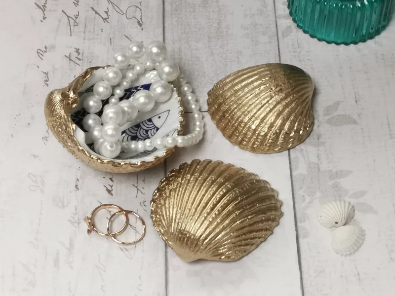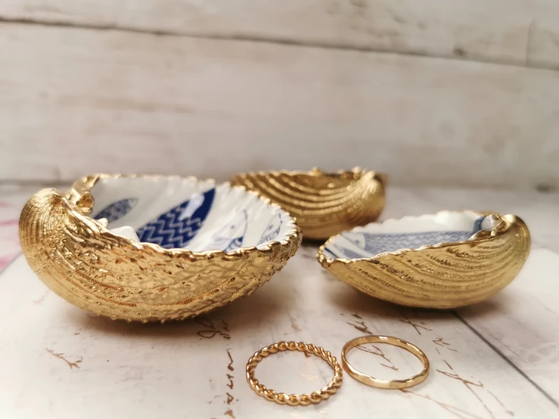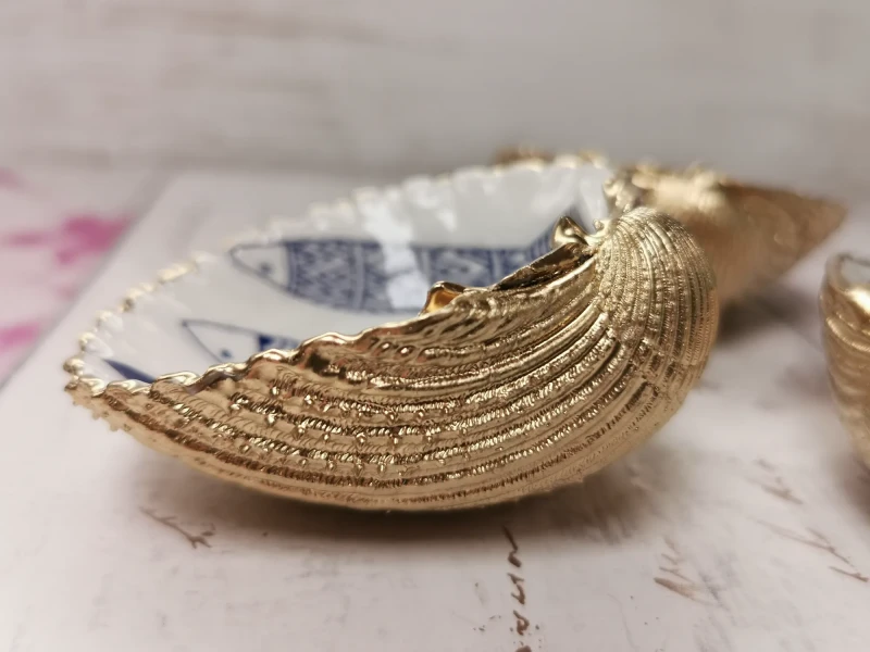Each shell is carefully glazed with glossy resin to give them both durability and the look of porcelain or china. The backs of the shells are hand gilded with liquid gold leaf in a classic gold.