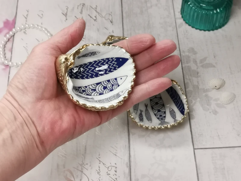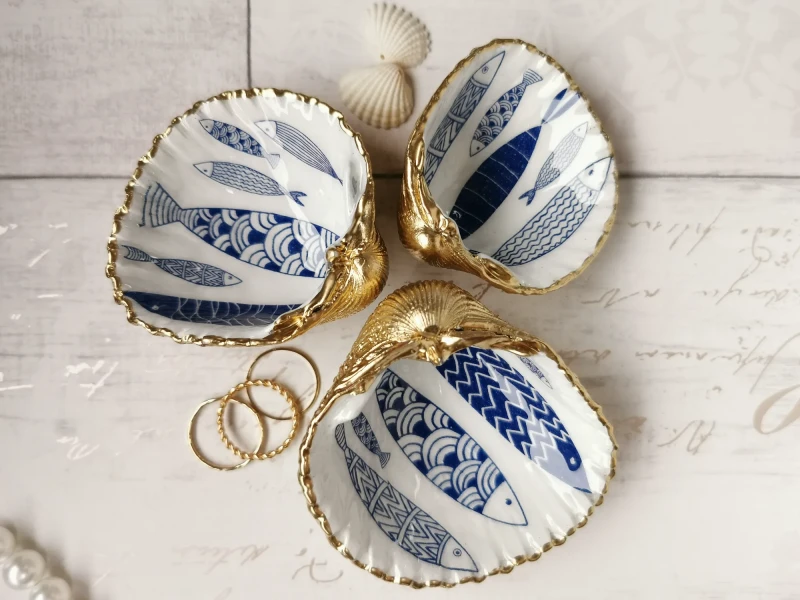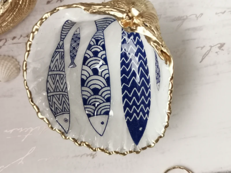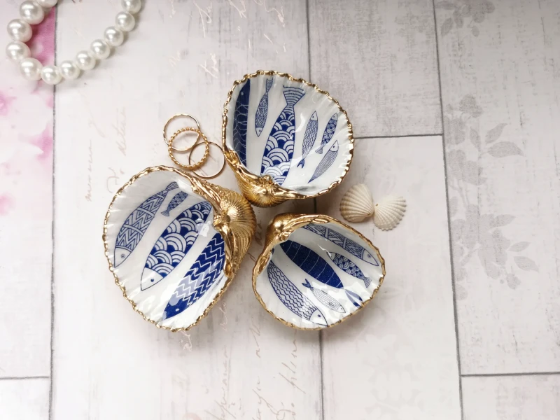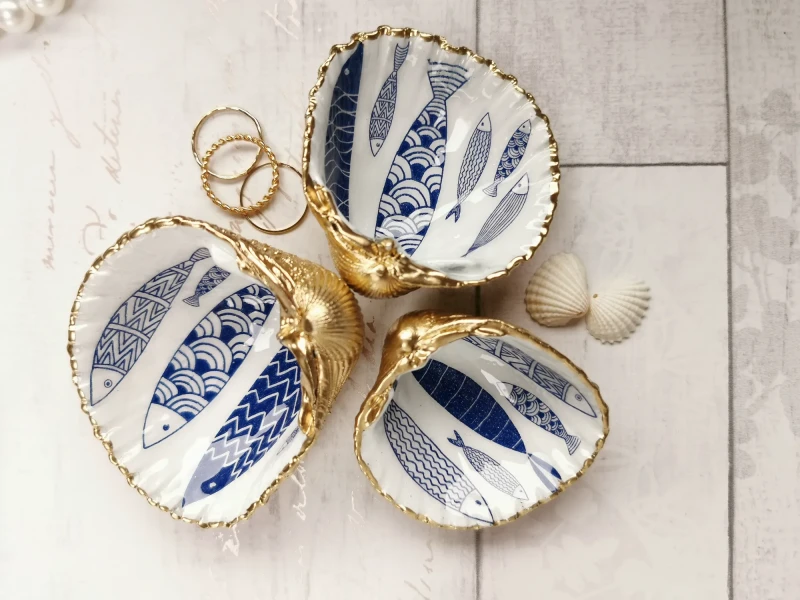 A set of 3 cockle shell ring or trinket dishes made from real shells with nautical blue fish.