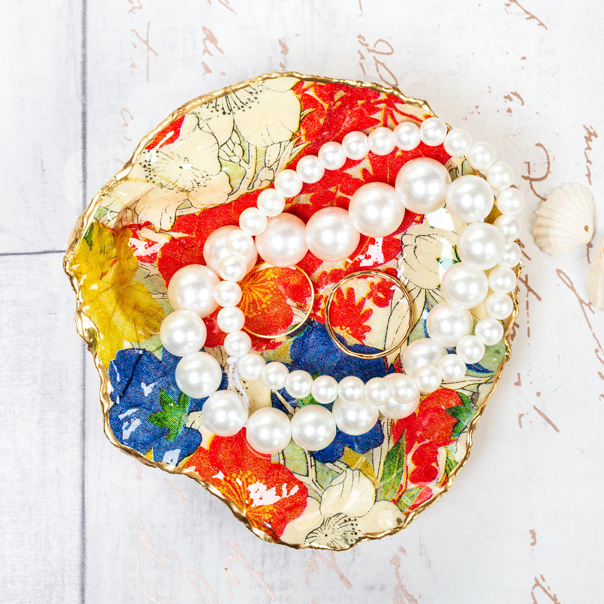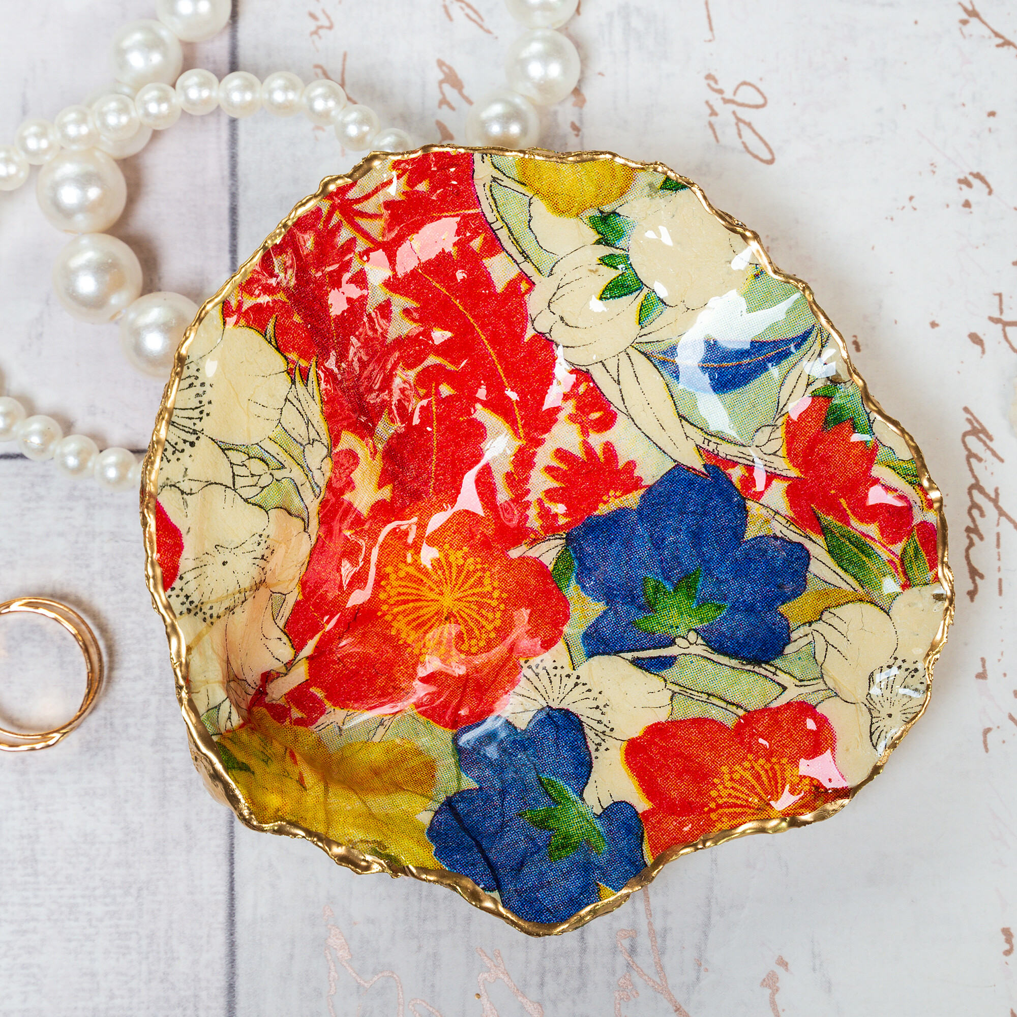 A shallow and iirregular shaped trinket dish handmade from a sea worn Dorset oyster shell and decorated in a Japanese floral in red and blue.