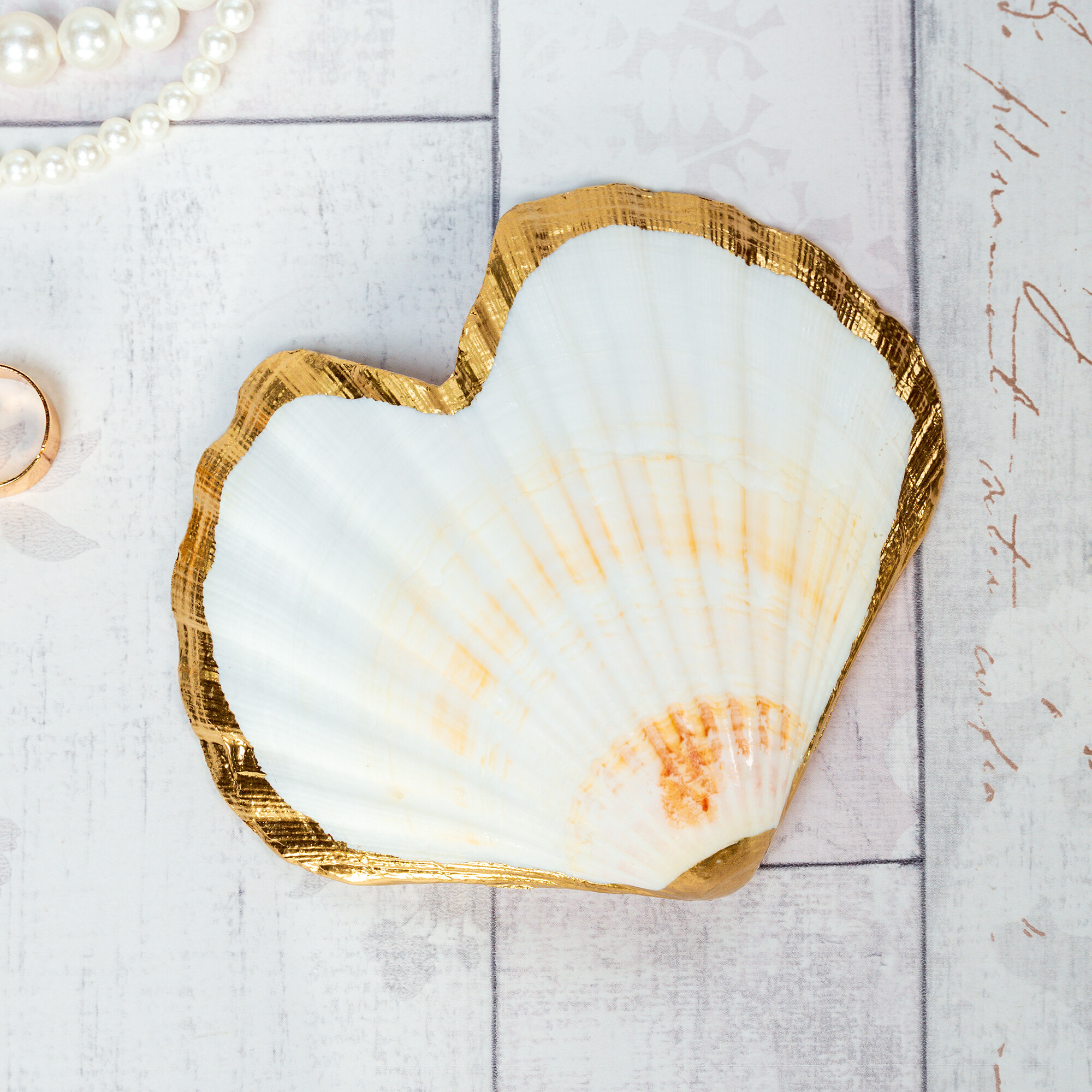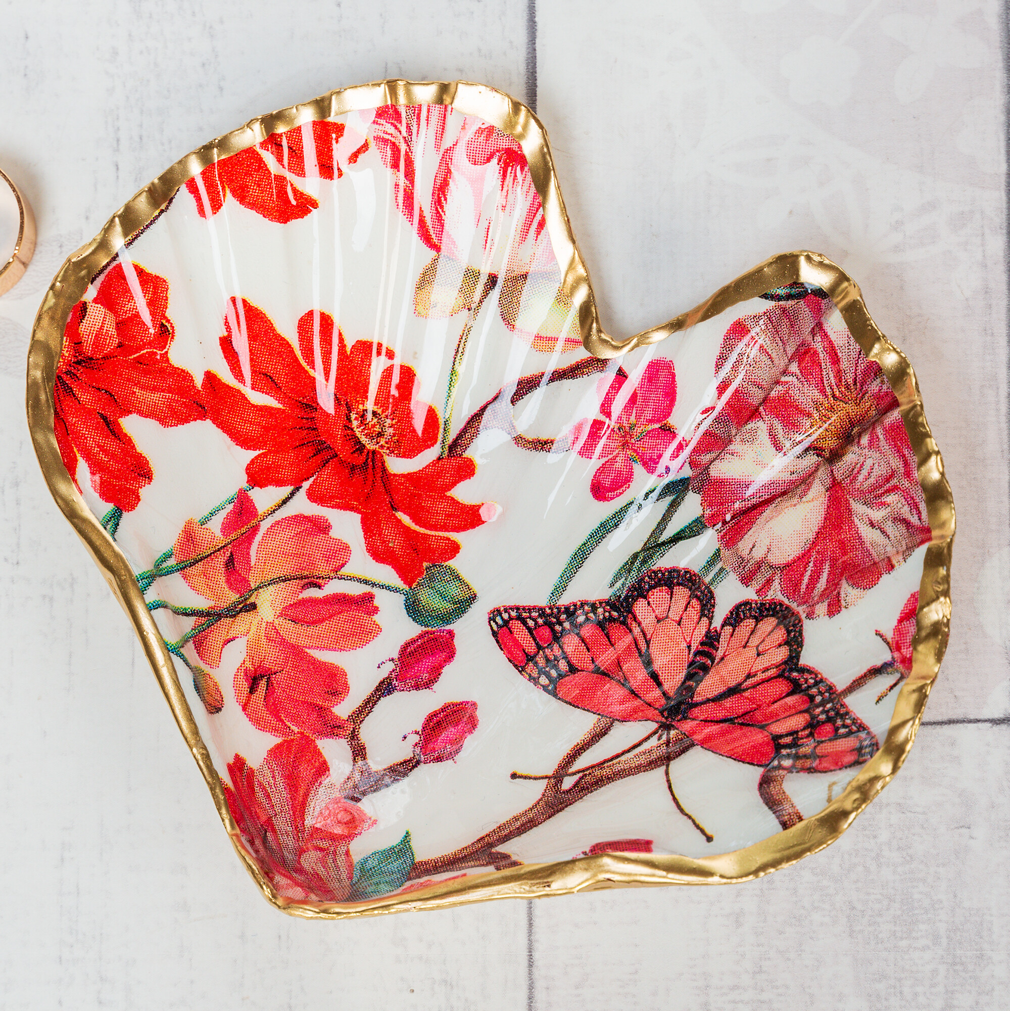 Gorgeous heart shaped trinket dish or ring tray, featuring pretty, reddish pink flowers and a butterfly. These trinket dishes are shaped by hand from natural scallop shells and make lovely Mother's Day, Valentine's or Galentine's gifts. The shells are sealed and glazed with resin on the inside, giving them durability and a beautiful glossy porcelain look. The edges of the shells are gilded with liquid gold leaf.