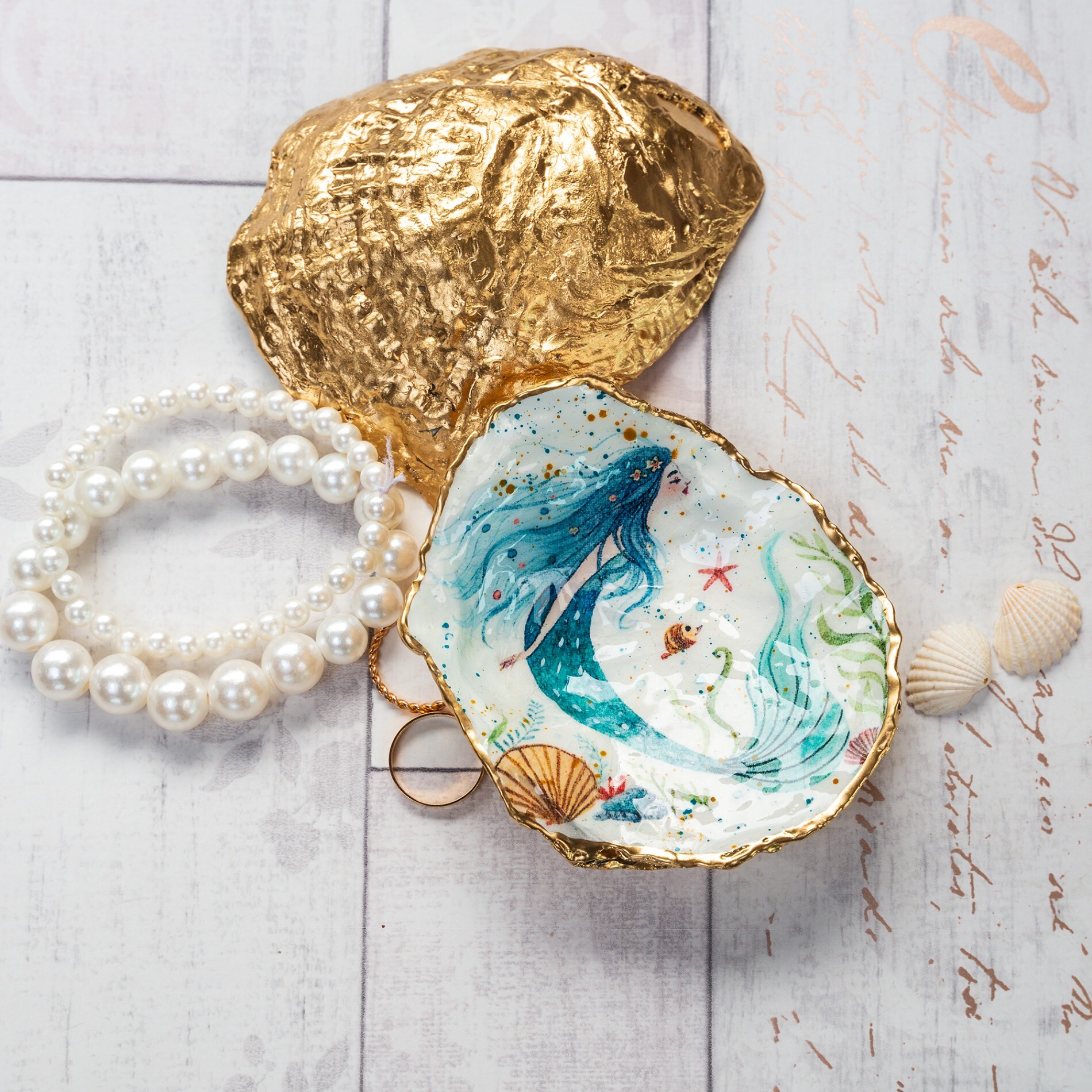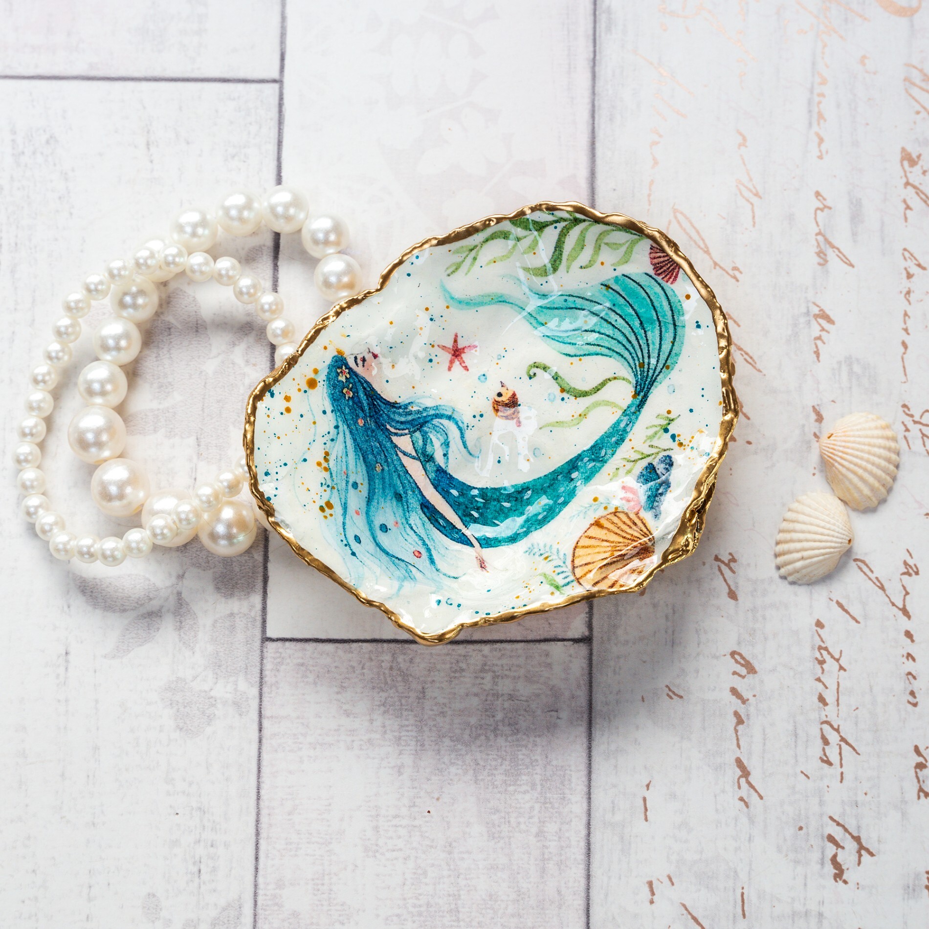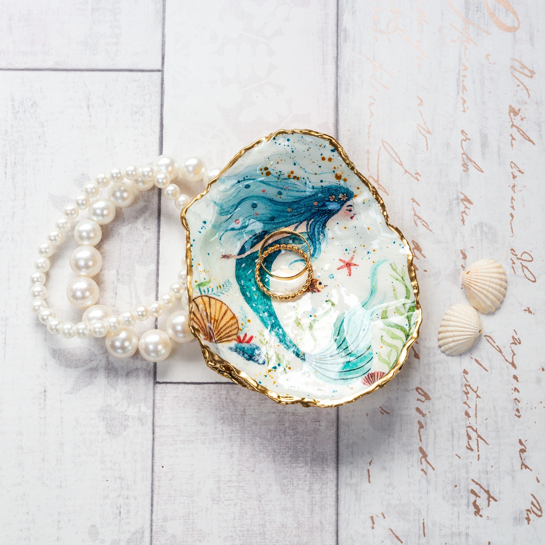 A shallow and iirregular shaped trinket dish handmade from a sea worn Dorset oyster shell and decorated with a mermaid in teals and gold.