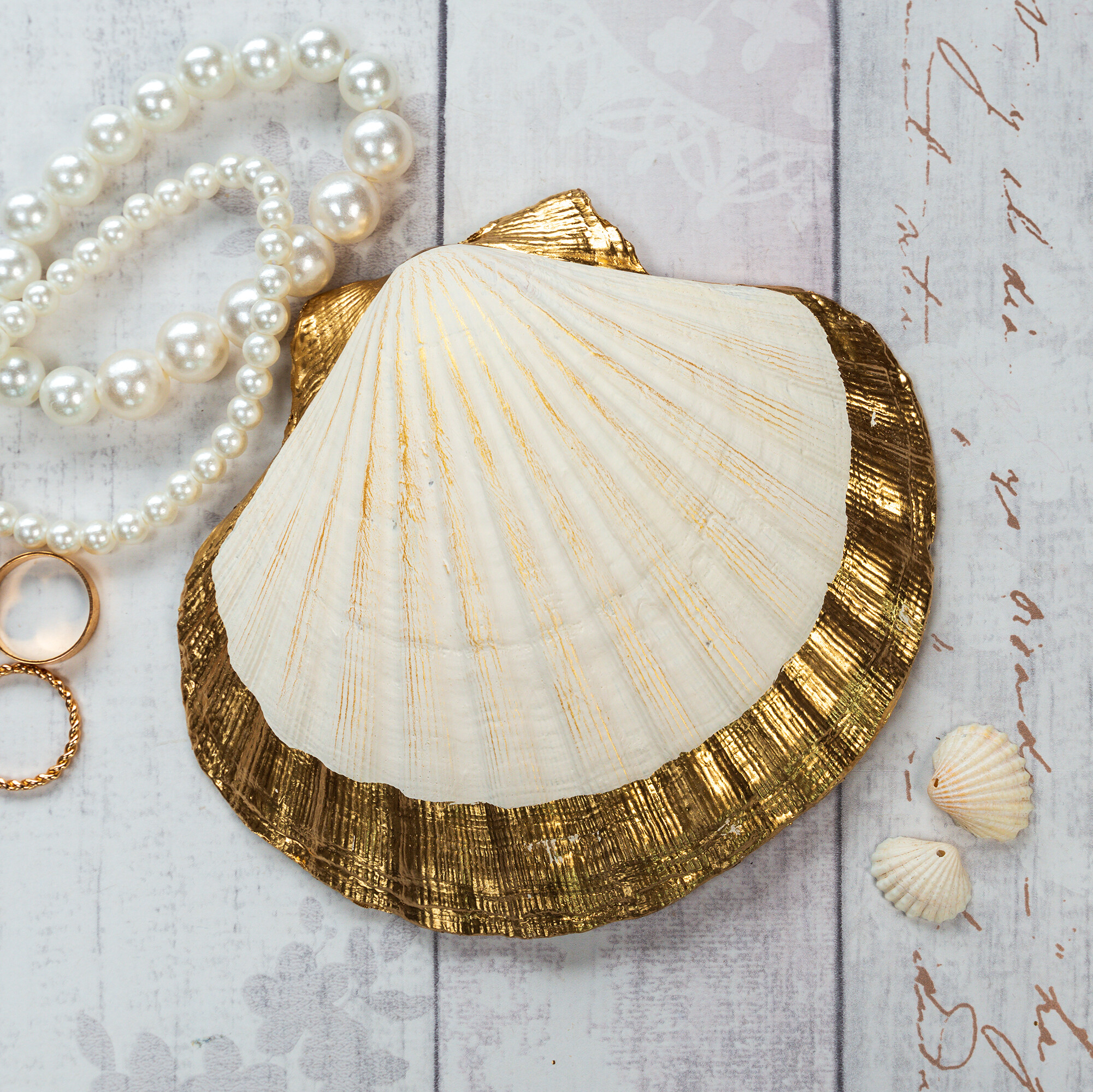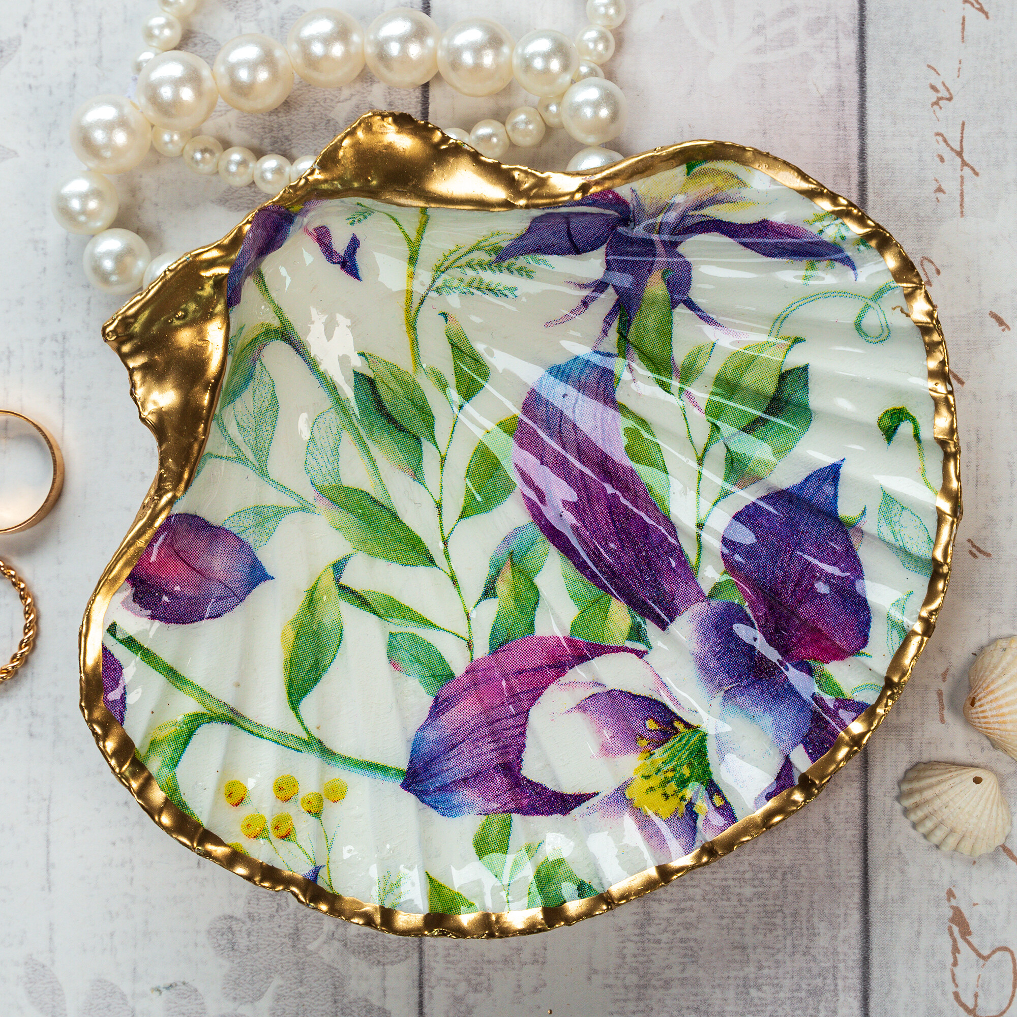 A decorative trinket dish or bowl in a pretty floral style with purple Aquilegia flowers. These trinket dishes are handmade from natural scallop shells. The shells are sealed and glazed with resin on the inside, giving them durability and a beautiful glossy porcelain look. The edges of the shell are gilded with liquid gold leaf.