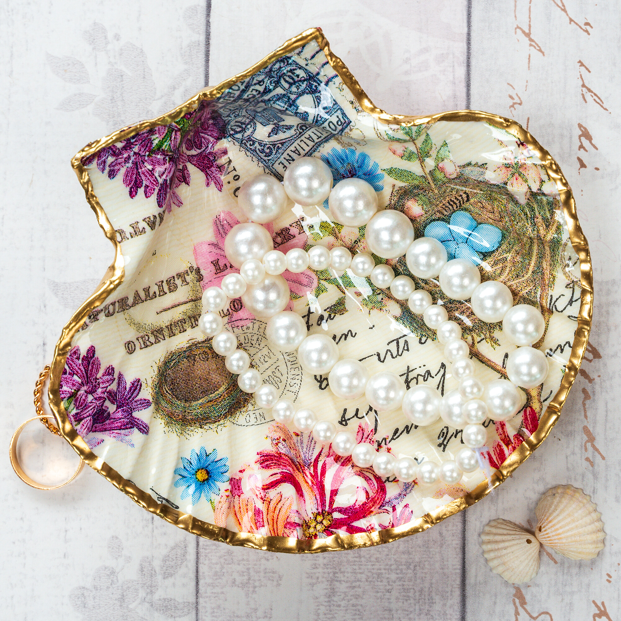 A trinket dish or bowl in gorgeous botanical design with a bird nest on a vintage, shabby chic background. These trinket dishes are handmade using the decoupage technique on to natural scallop shells. The shells are sealed and glazed with resin on the inside, giving them durability and a beautiful glossy porcelain look. The edges of the shell are gilded with liquid gold leaf.