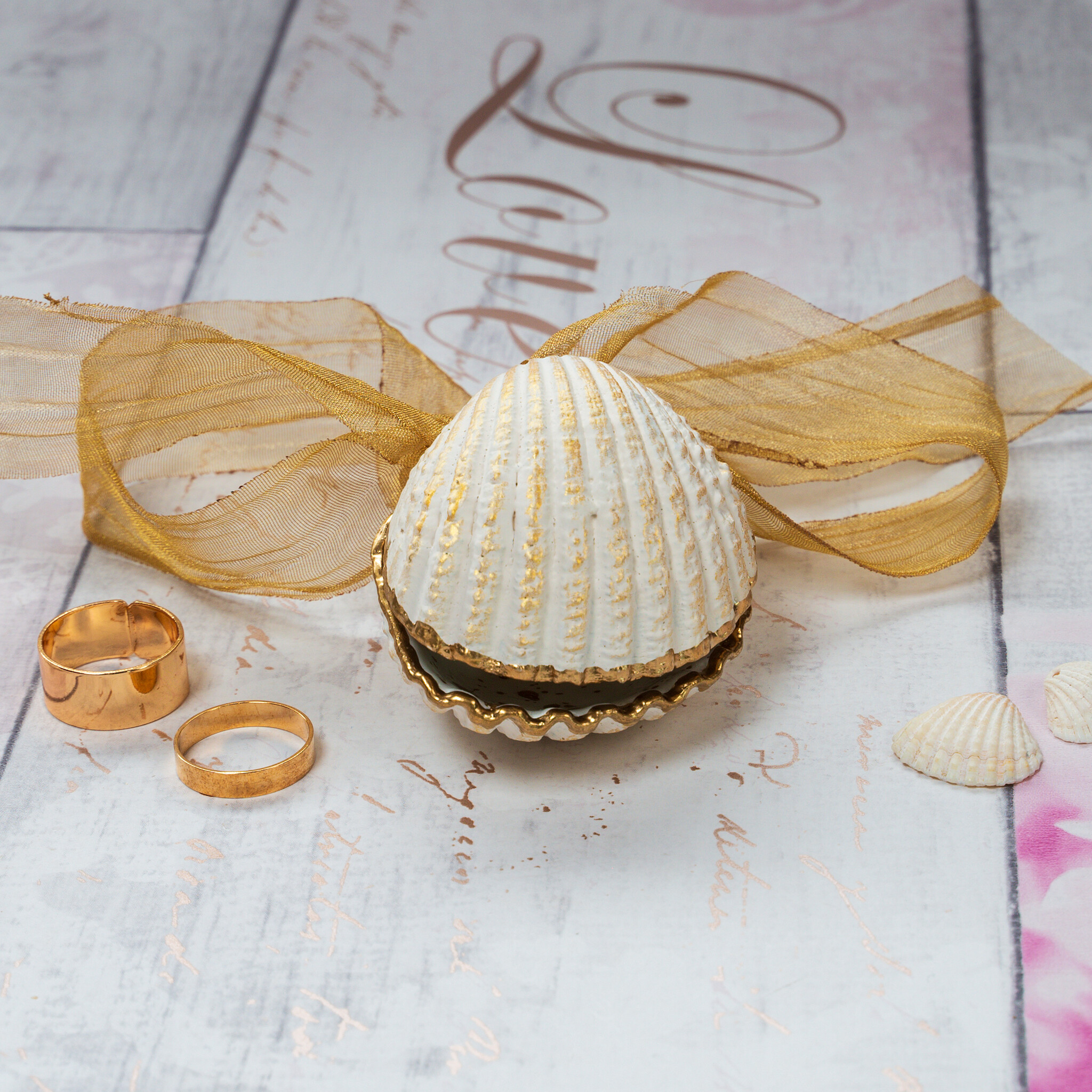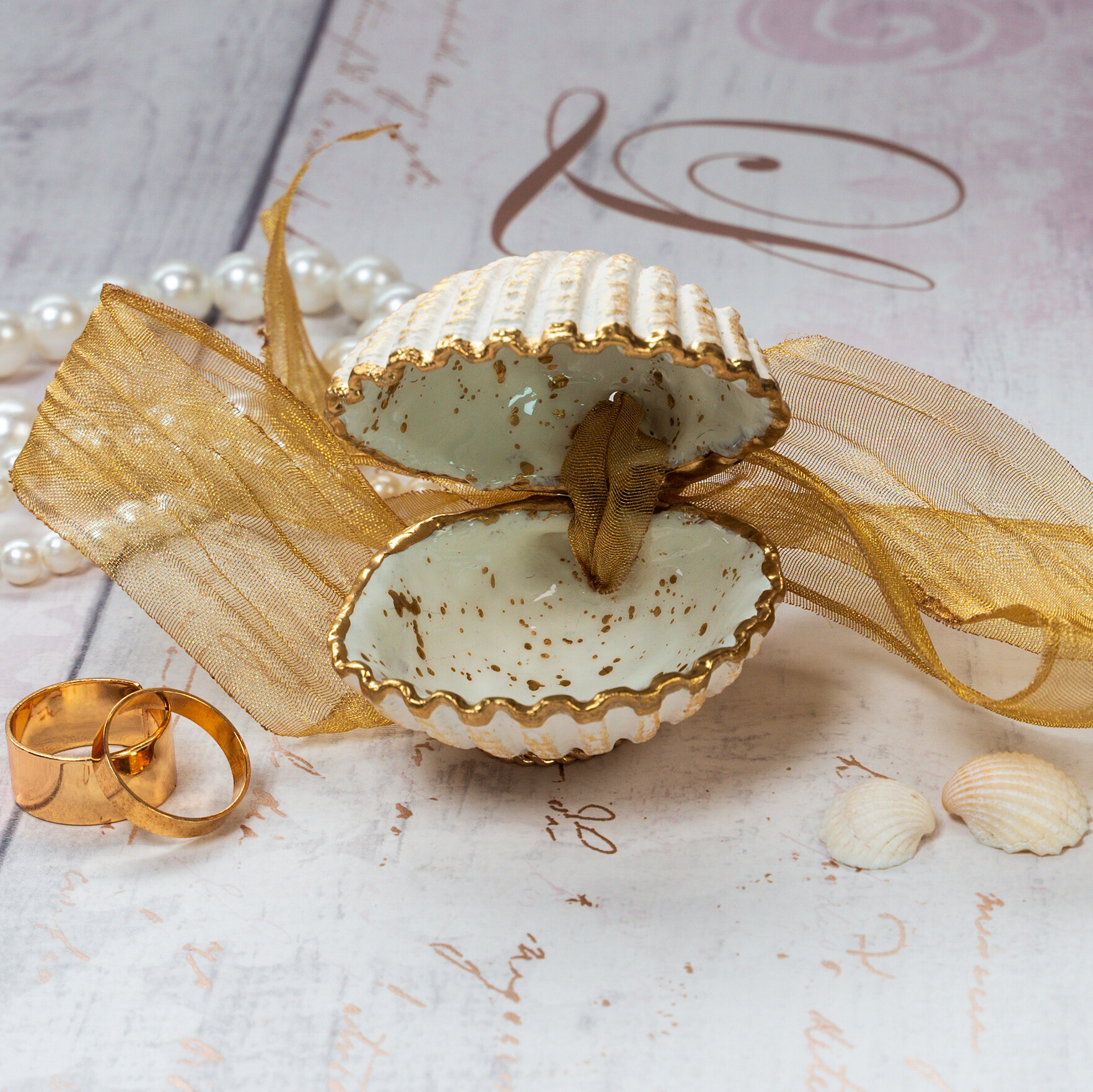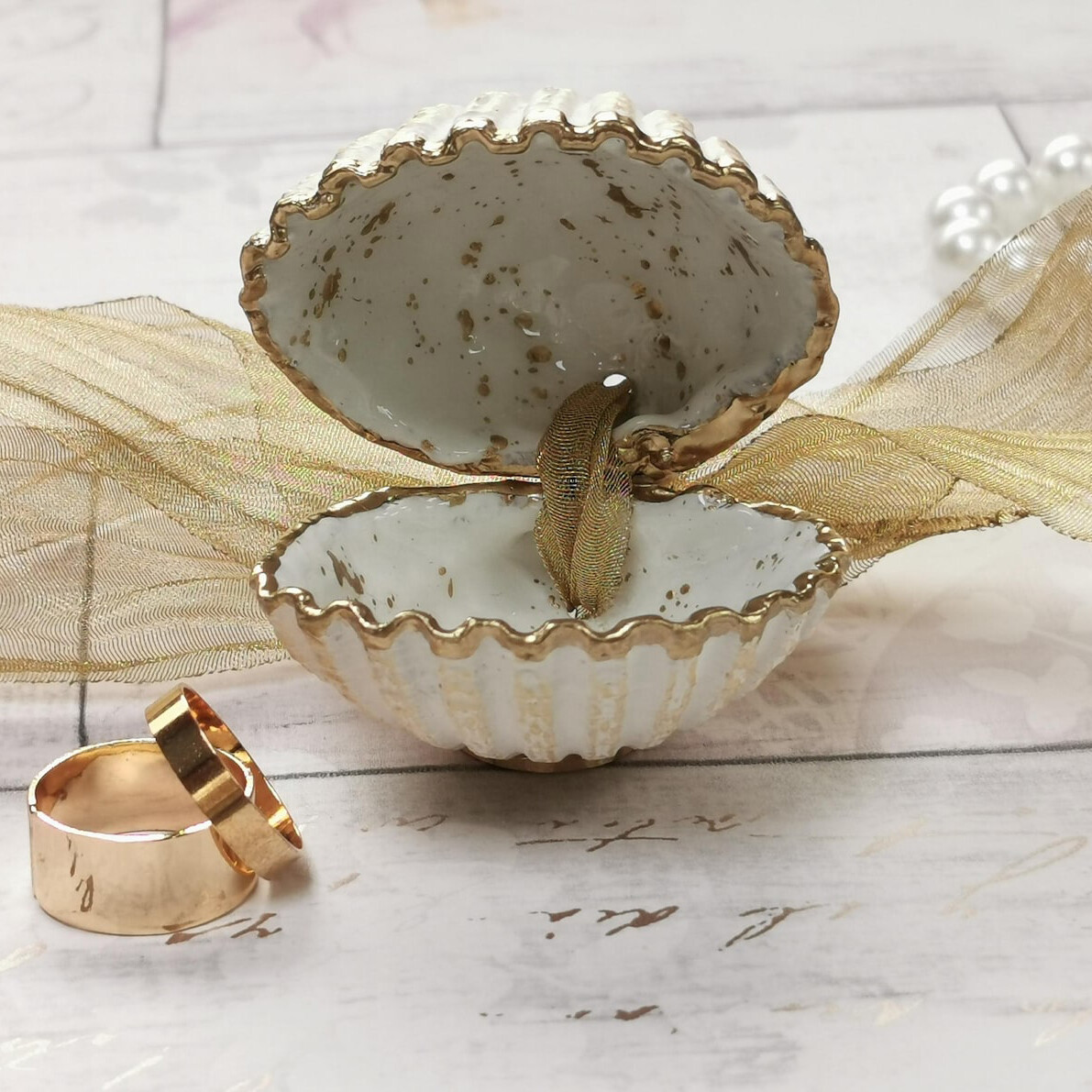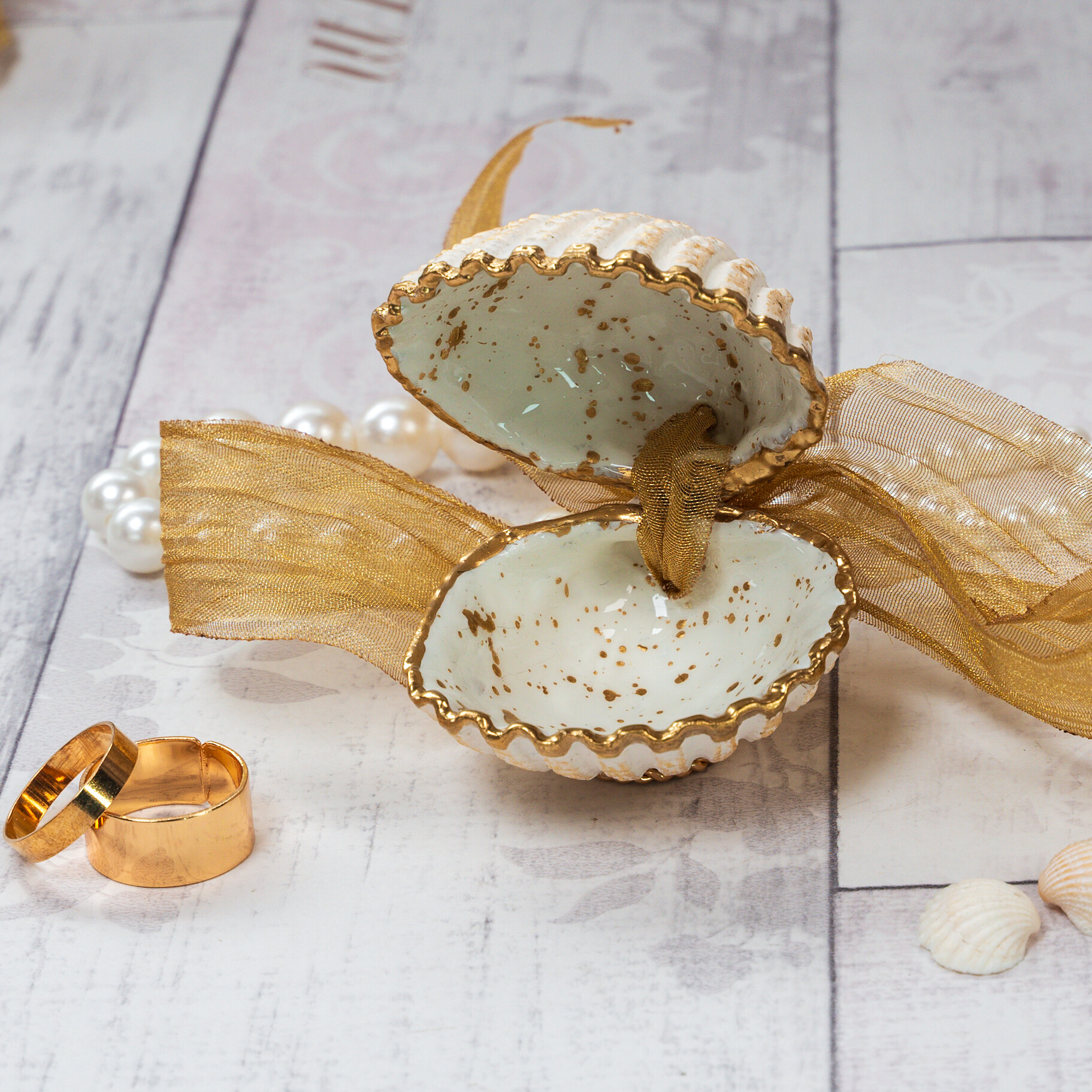 Handmade cockle shell ring box for beach proposals, weddings, promise or engagement ring storage. This ring box is made from natural seashells which are hand painted and finished with glossy resin, the shell edges are gilded with liquid gold leaf and the backs are painted cream and brushed with gold. The box is hinged with gold ribbon, tied in a bow. You can also tie the ribbon over the shells to keep closed and detach the ribbon to make 2 separate ring dishes.